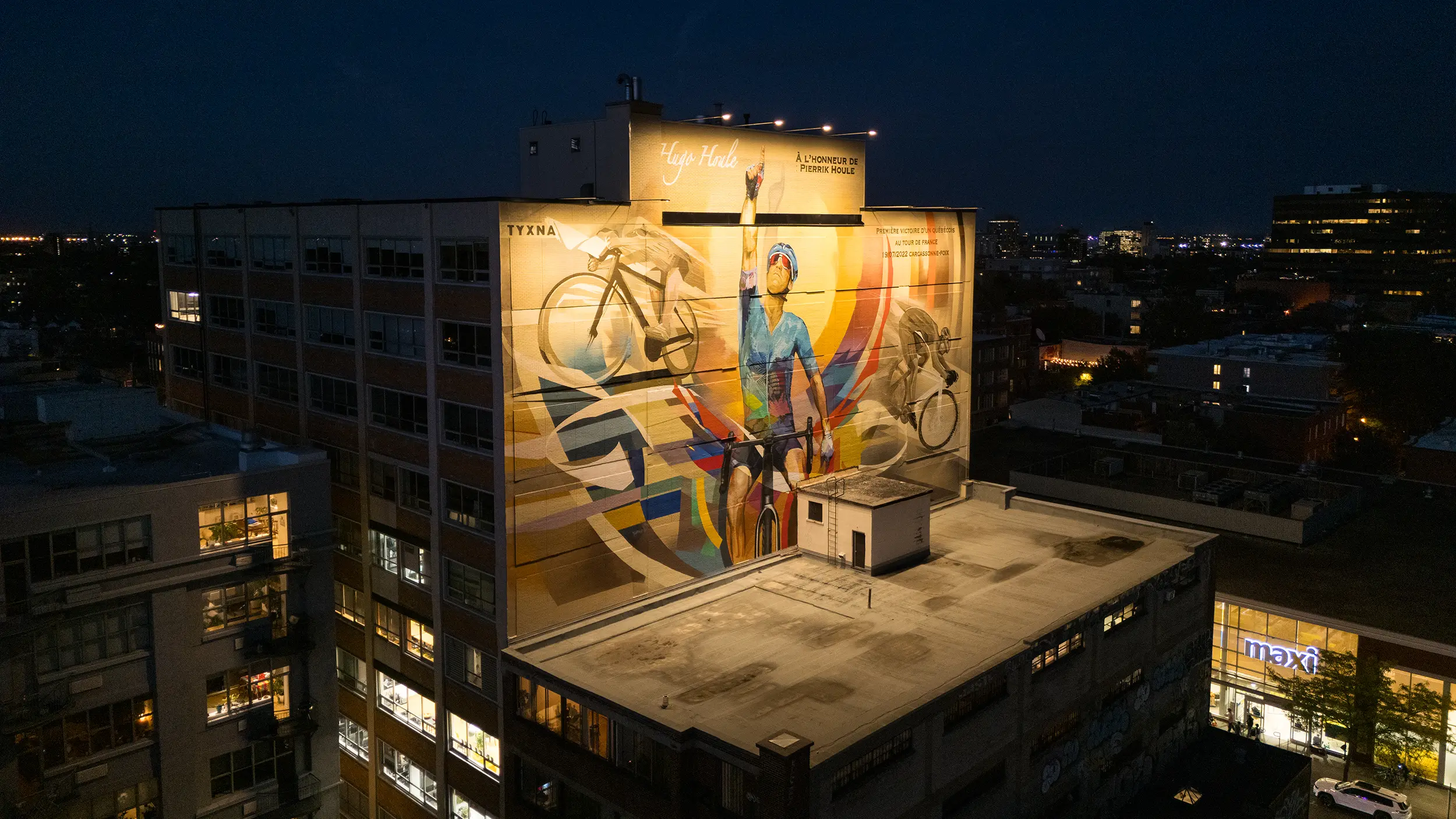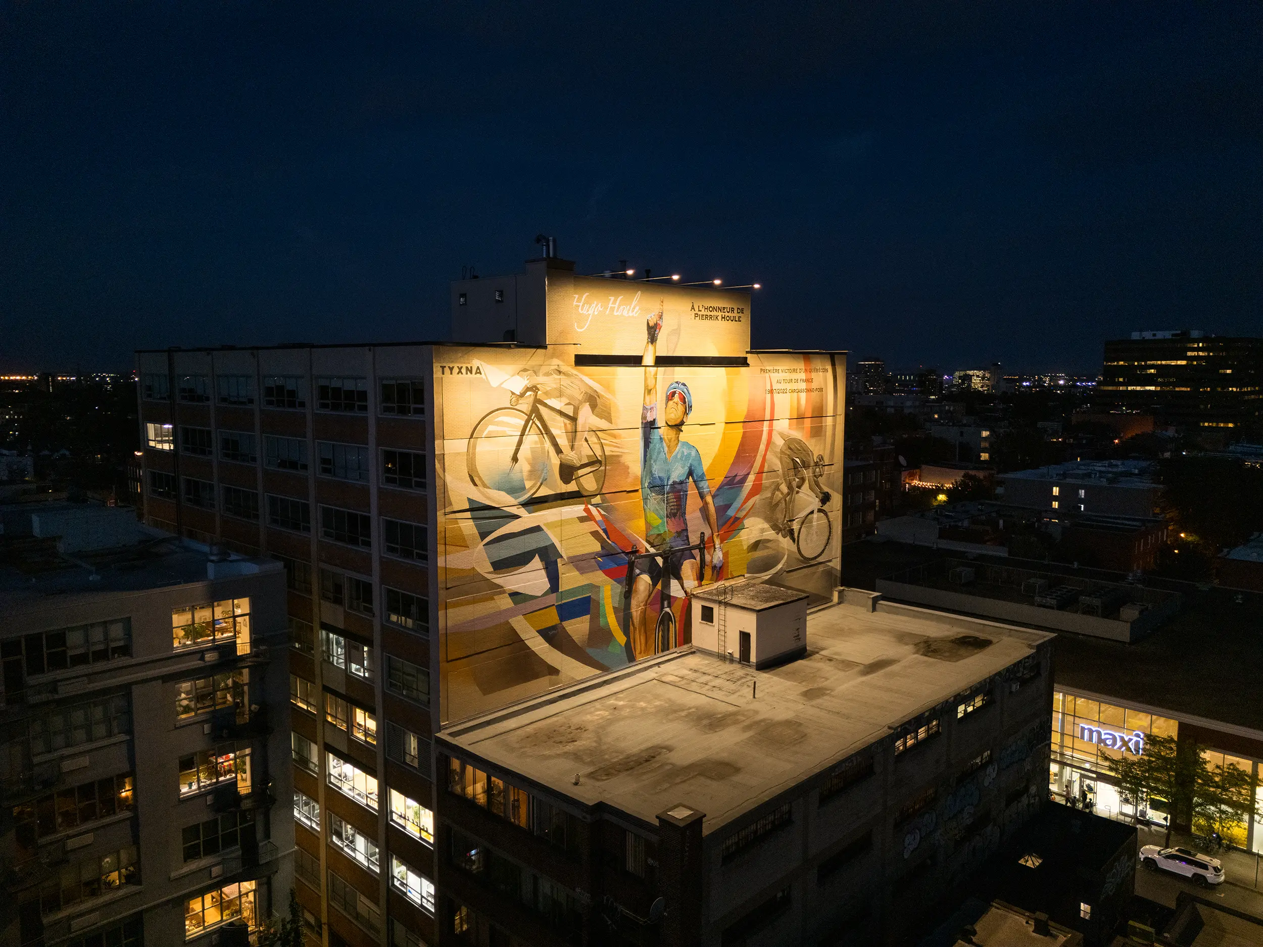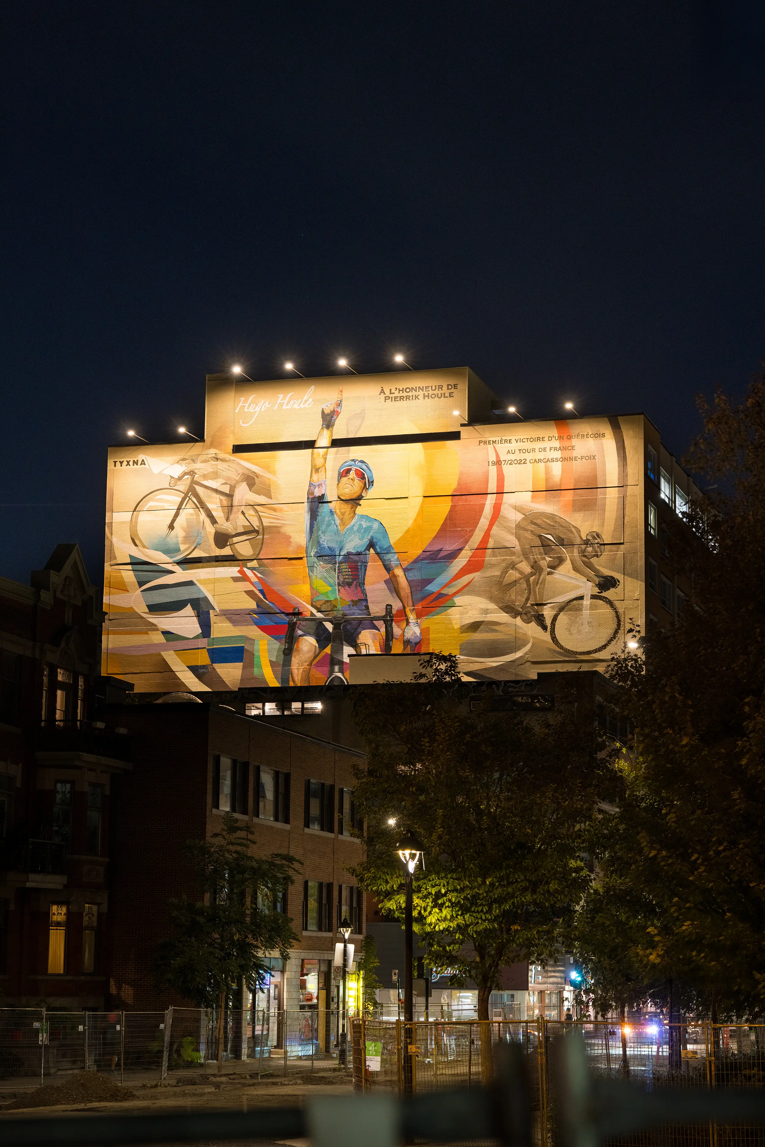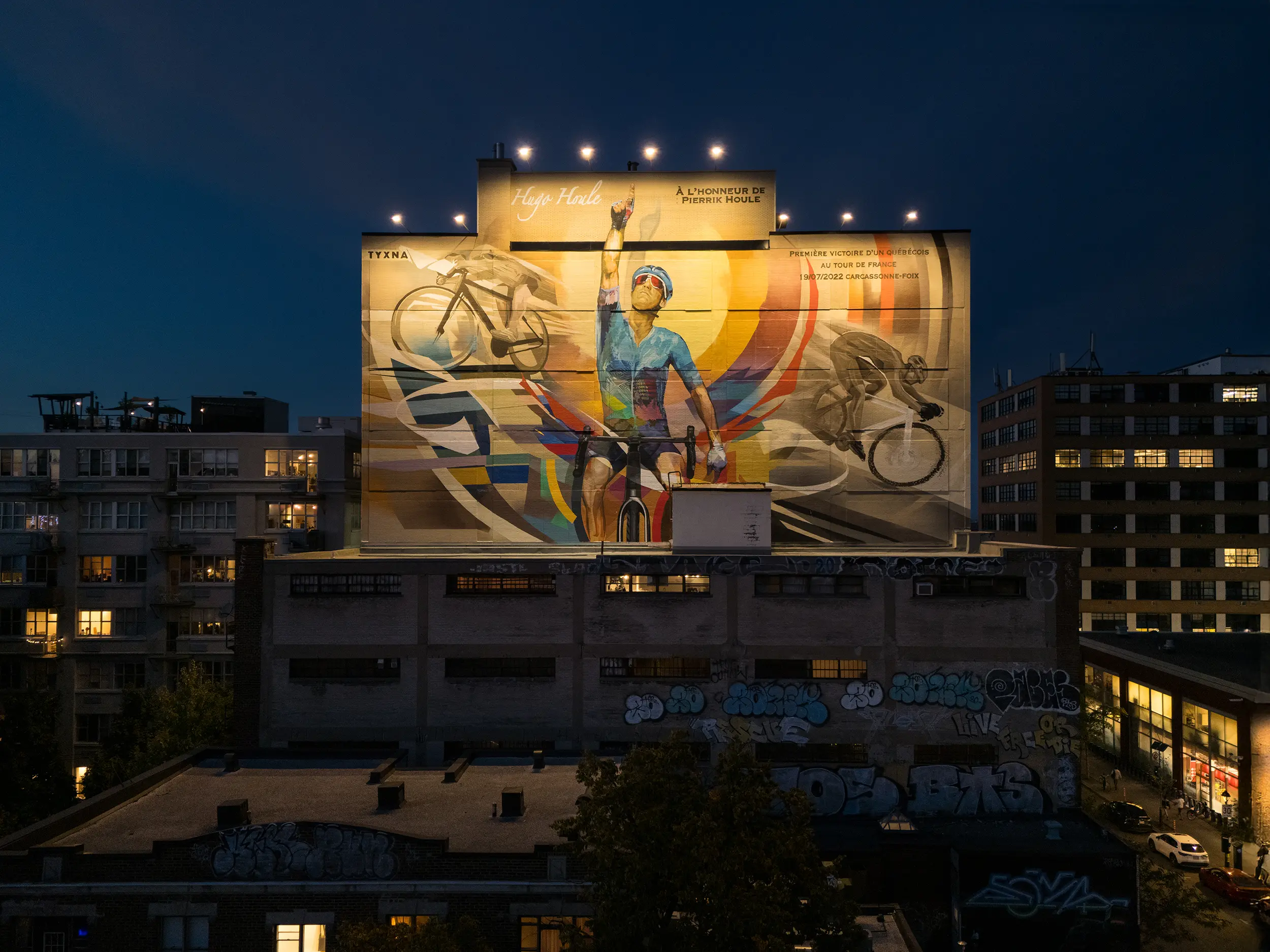 Montreal-based artist collective TYXNA has created their largest mural in Montreal to date, a monumental 650 m² tribute to cyclist Hugo Houle. To ensure it stands out both day and night, they partnered with Concept Illumination to design and deliver a custom lighting solution. Now visible notably from Mount Royal, the mural has become a true landmark within Montreal’s urban landscape.