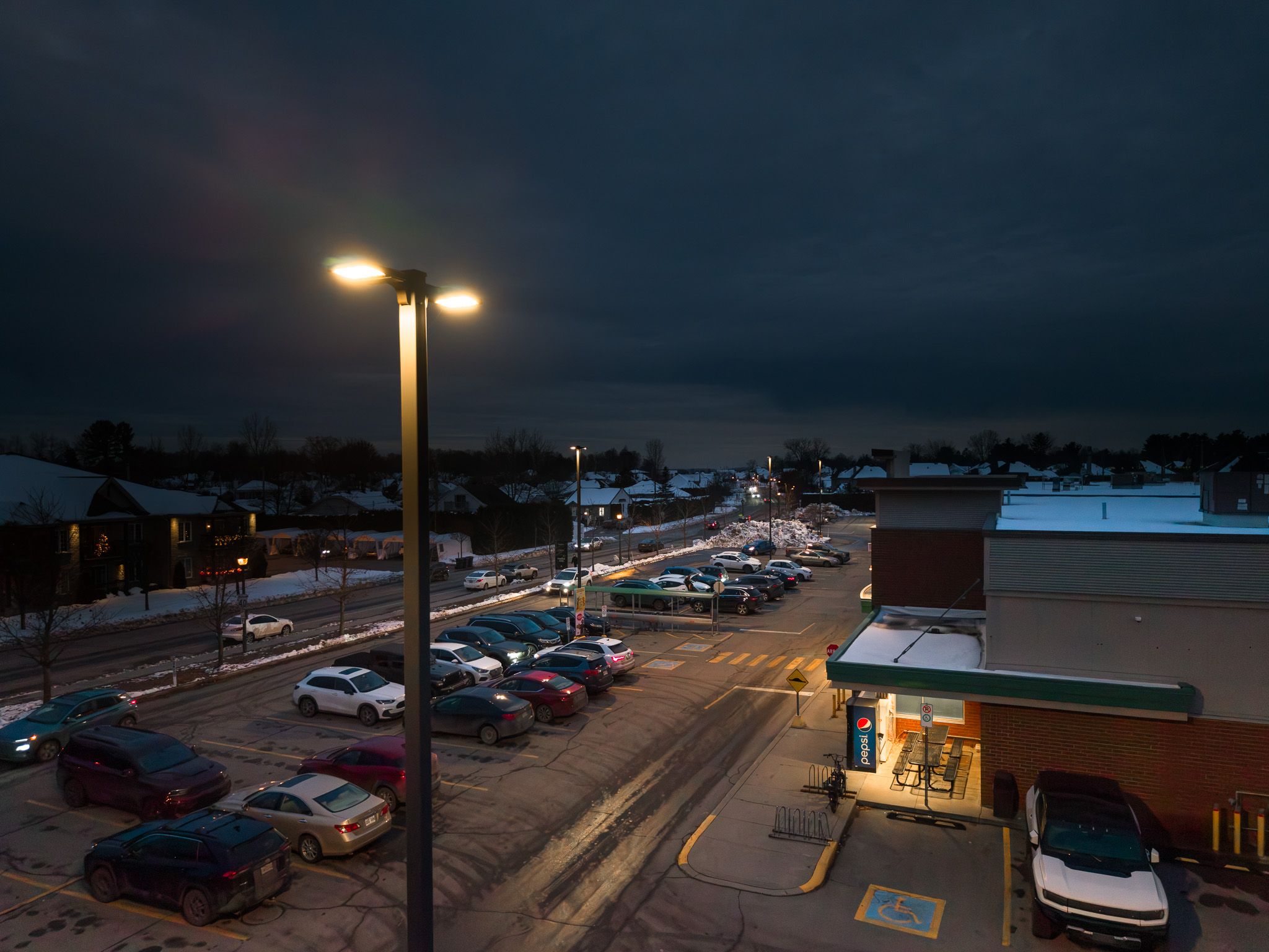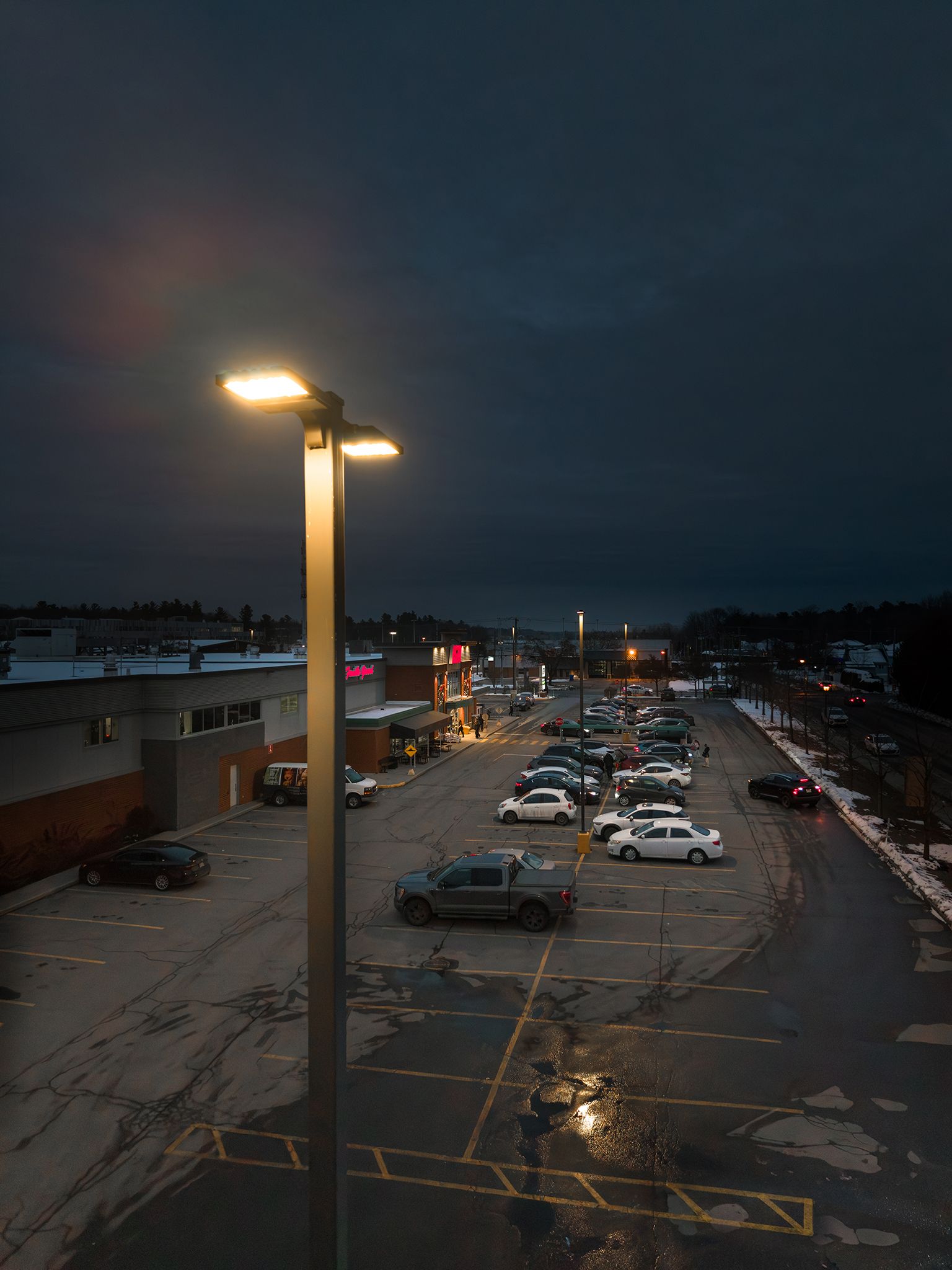 Au terme du mandat, les 12 propriétés ont été entièrement converties à la technologie DEL. La qualité et l’uniformité de l’éclairage ont été nettement améliorées, contribuant à une meilleure lisibilité des sites et à un environnement plus sécuritaire pour les locataires, les visiteurs et les usagers. À long terme, Crombie REIT bénéficie d’une réduction des coûts de maintenance, d’une performance énergétique accrue et d’une mise en valeur renforcée des façades et des espaces extérieurs.